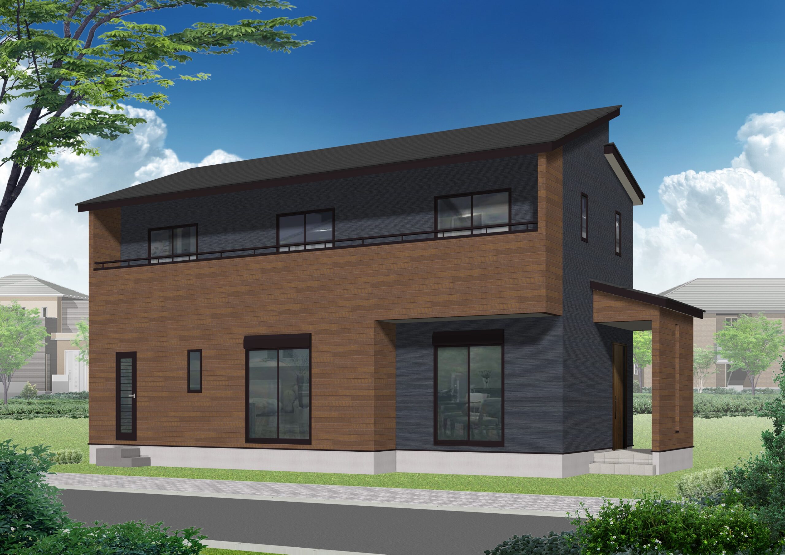 ブラックの外壁をベースに、ブラウンの木目調の外壁をアクセントとして使用!