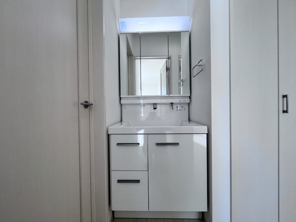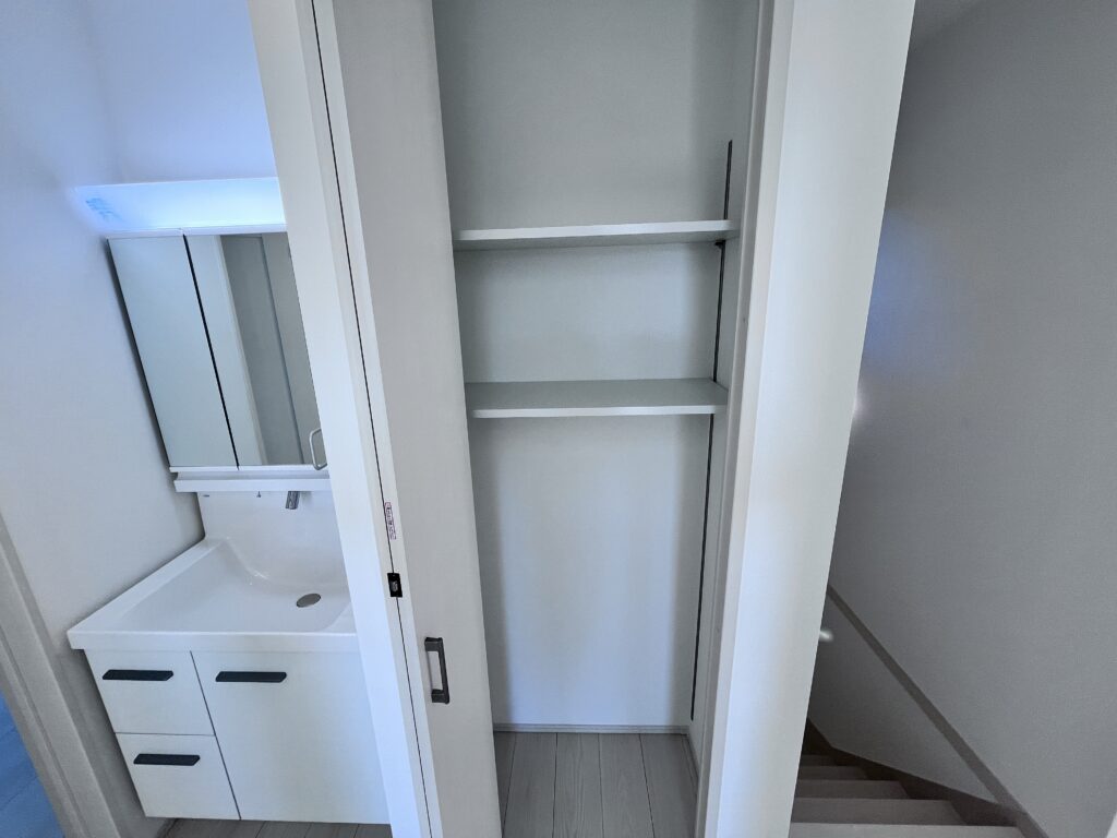 洗面化粧台のそばには収納もあります