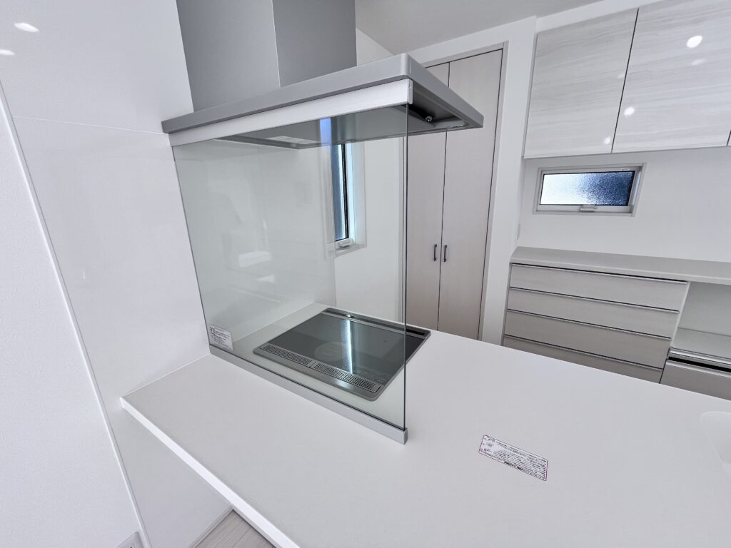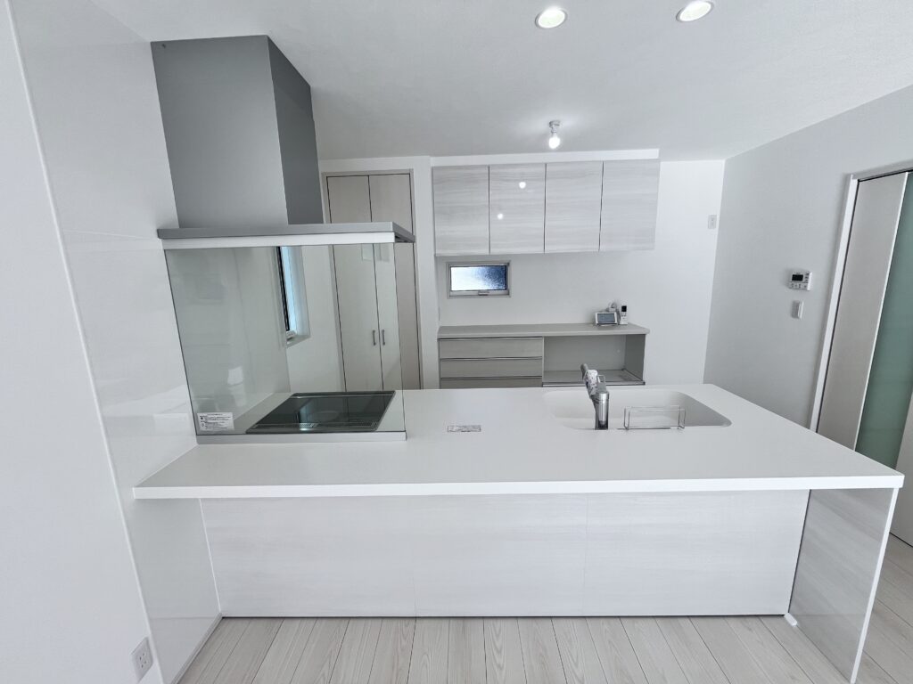 キッチンはLDK全体を眺められるペニンシュラキッチンを採用。リビングエアコン設置済みです!
