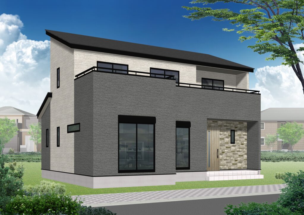 グレー×ホワイトのツートーンの外壁でトレンドのシンプルモダンなスタイルでありながら、