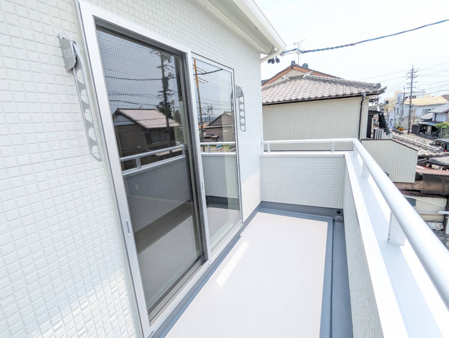 居室に負けないぐらい広いバルコニーは2階の2つの居室から出入りすることができるから、休日の朝、片方の部屋に寝ている家族がいても別の部屋から入って洗濯物を干すことができます!