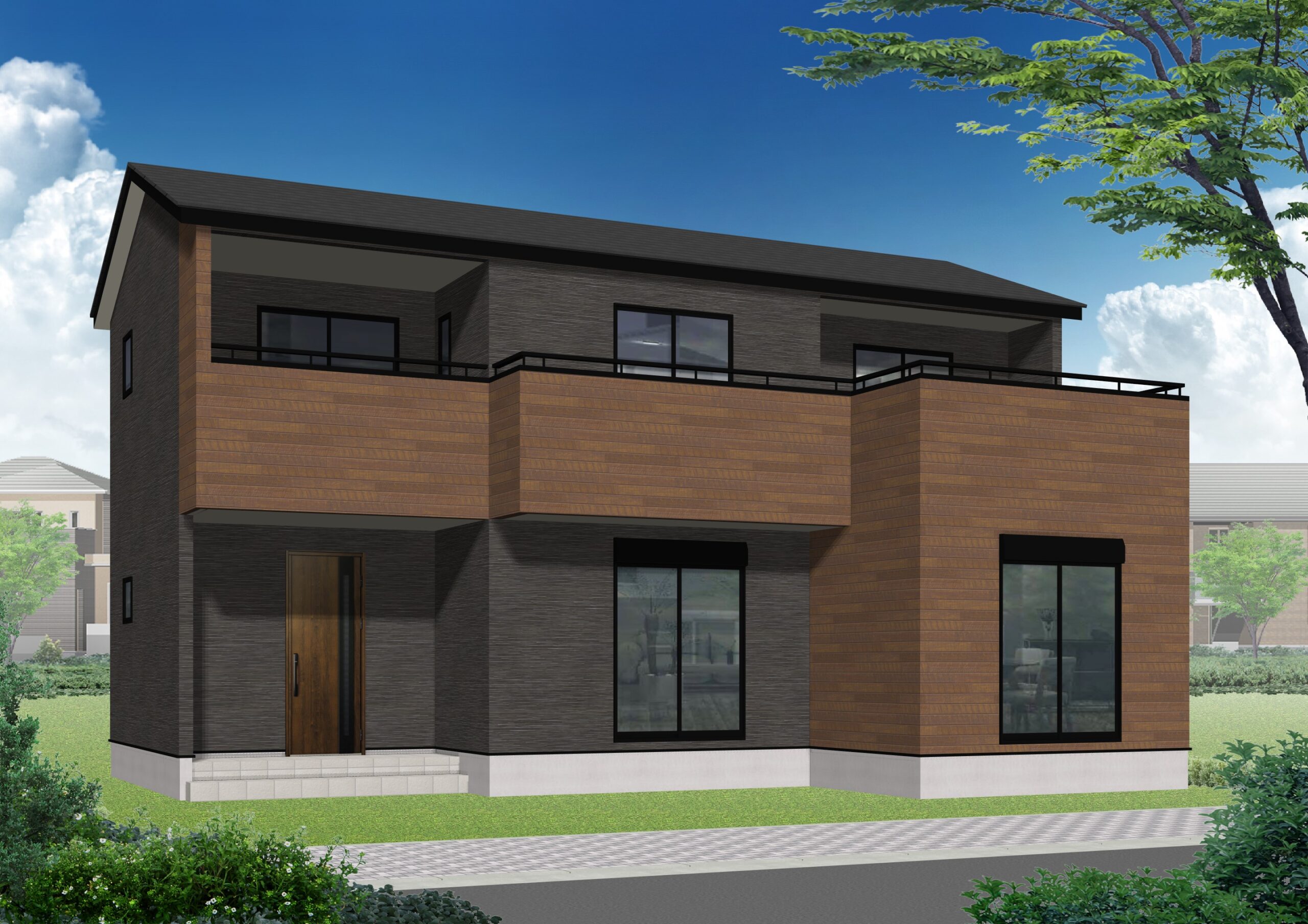 ブラックをベースにしながら、バルコニーにブラウンの木目調の外壁を使用することにより都会的で洗練された印象になっています!