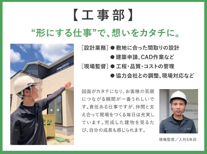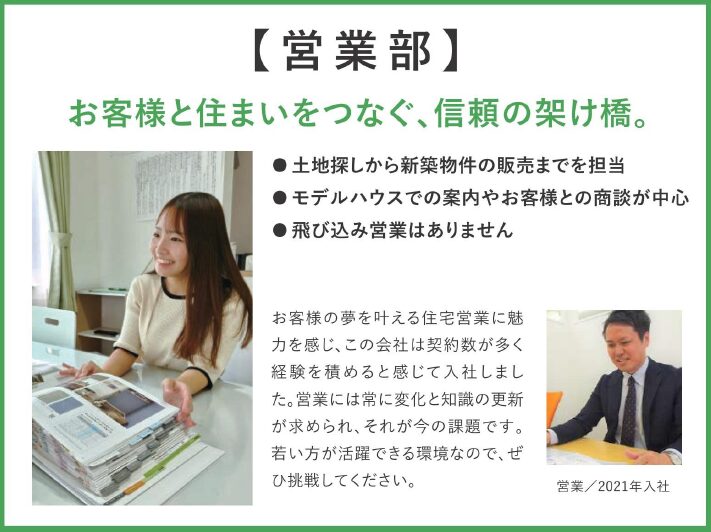 【業務内容】 新築分譲住宅の計画、販売。注文住宅営業。用地仕入れ、広告の作成やチラシ配布、現場管理、商談、アフターなどの業務。